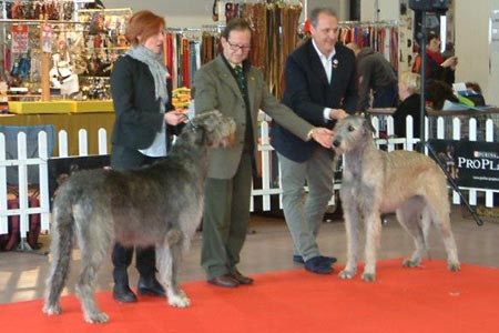 16 e 17 febbraio 2013 – Alla doppia Esposizione Internazionale di Fribourg (CH) Miltonia dei Mangialupi ha ottenuto entrambi i giorni CAC, CACIB e BOB, mentre Glor na Gael Victoria ha vinto la classe campioni, conseguendo il CAC. Nella foto BOS e BOB del sabato, giudice Juan Naveda Carrero (E), mentre la domenica il giudice è stato Christine Rossier (CH).