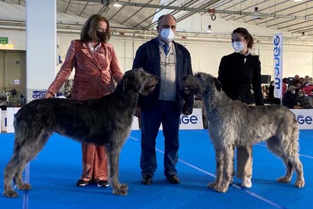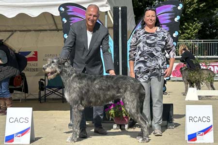 10 settembre 2022 - A Pompadour (F), fra 57 Irish Wolfhound giudicati da Jocelyne Gagnè, Major Mick del Mangialupi ha conseguito CACS e BOB, mentre Urania dei M. ha ottenuto il CACS nelle femmine.